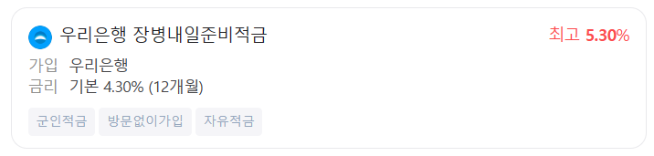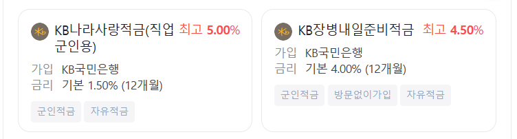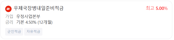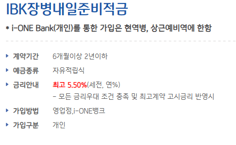 | IBK 장병내일준비적금 | 우체국장병내일준비적금 | 국민 KB나라사랑적금 |