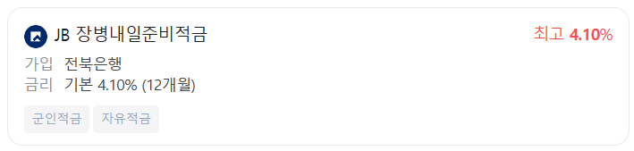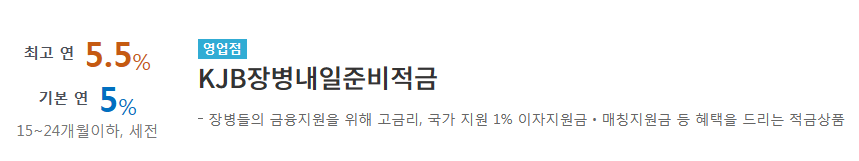 | 전북JB장병내일준비적금 | 수협 SH평화수호적금 | 광주 KJB장병내일준비적금 |