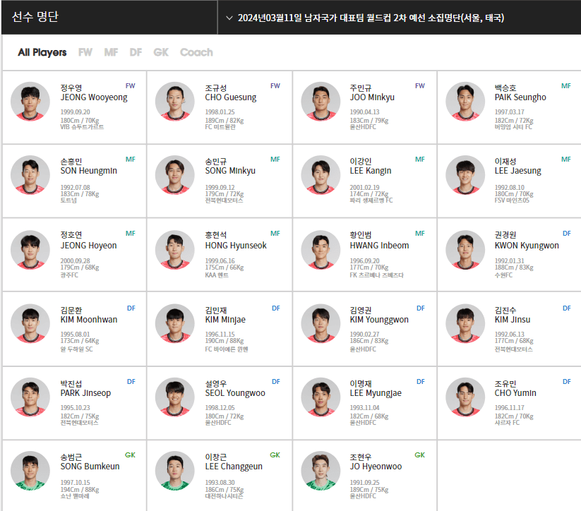 한국 축구 대표팀, 2026 FIFA 북중미 월드컵 아시아 2차 예선 명단 및 일정보기에서 태국과 맞대결 한국 축구 협회(KFA)가 11일에는 2026 FIFA 북중미 월드컵 아시아 예선 2차전에서 태국과의 두 경기에 참가할 23명의 대표팀 멤버 명단을 발표했습니다. 이번 두 경기는 지난 달 올림픽 팀 감독 황선홍이 A대표팀의 대행 코치로 임명된 이후로 처음으로 열리는 공식 경기입니다.(2026 북중미 월드컵 아시아 예선 2차 명단 및 일정보기 (ft.대한민국 vs 태국 축구 무료 중계 보기)