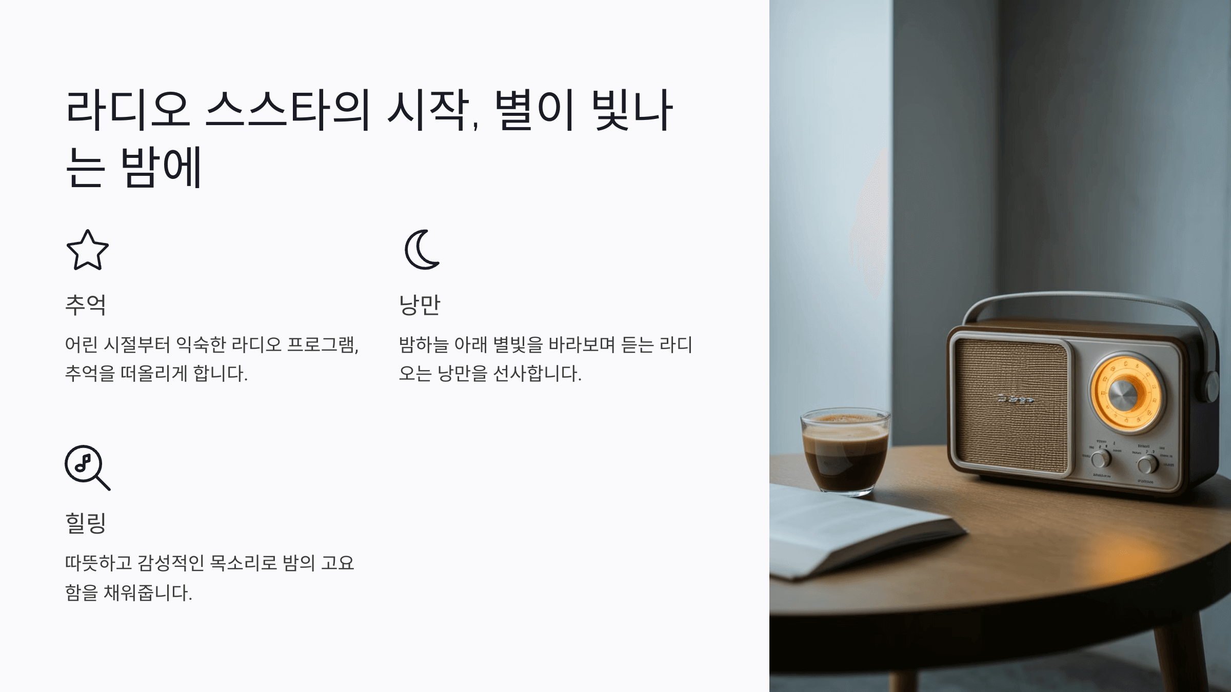 사연과 음악을 중심으로 진행되는 이 프로그램은 청취자들이 보내는 진솔한 이야기를 바탕으로 따뜻한 위로를 건넵니다. 정서적으로 지친 이들이 편안히 하루를 마무리할 수 있는 공간으로 자리 잡고 있으며, 다양한 연령층의 청취자들에게 꾸준히 사랑받고 있습니다.