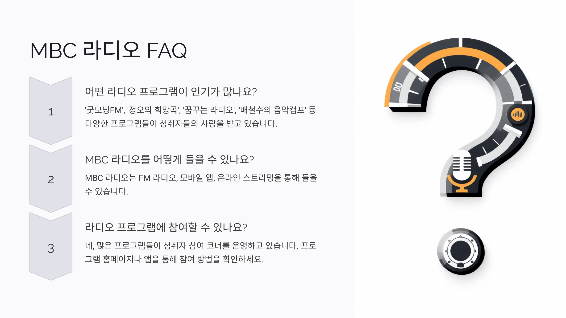 MBC 라디오 프로그램에 대해 궁금한 점들을 모아 자주 묻는 질문(FAQ)으로 정리했습니다. 이를 통해 라디오 팬들, 초보 청취자, 그리고 프로그램에 대해 더 알고 싶은 분들께 유익한 정보를 제공하고자 합니다.