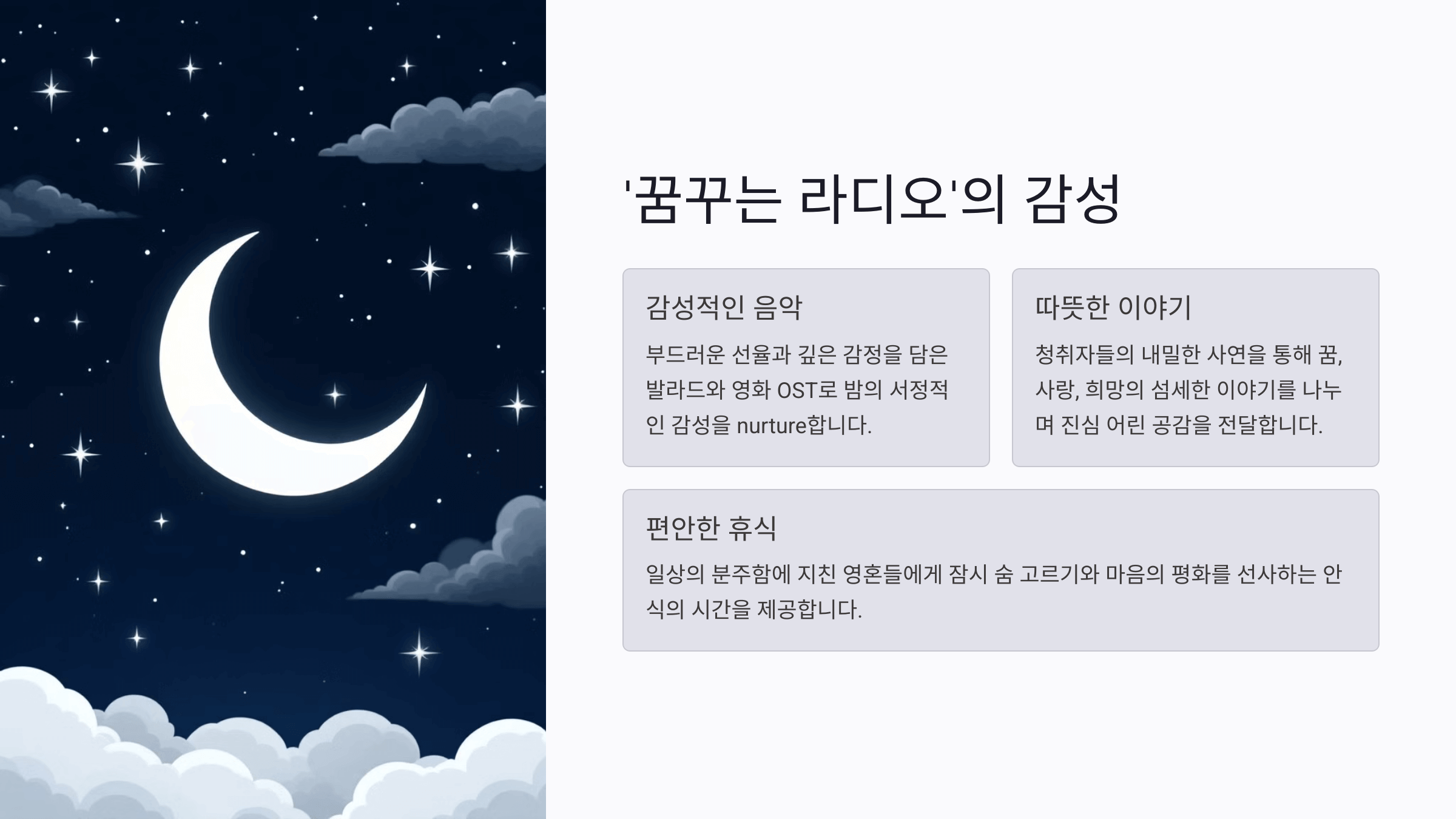 '꿈꾸는 라디오'는 저녁 시간의 감성을 자극하는 프로그램이에요. 잔잔한 음악과 따뜻한 이야기를 통해 하루의 끝을 마무리하는 데 도움을 주죠. 특히 청취자들과 교감하는 사연 코너와 DJ의 차분한 목소리는 이 프로그램의 특징이에요.