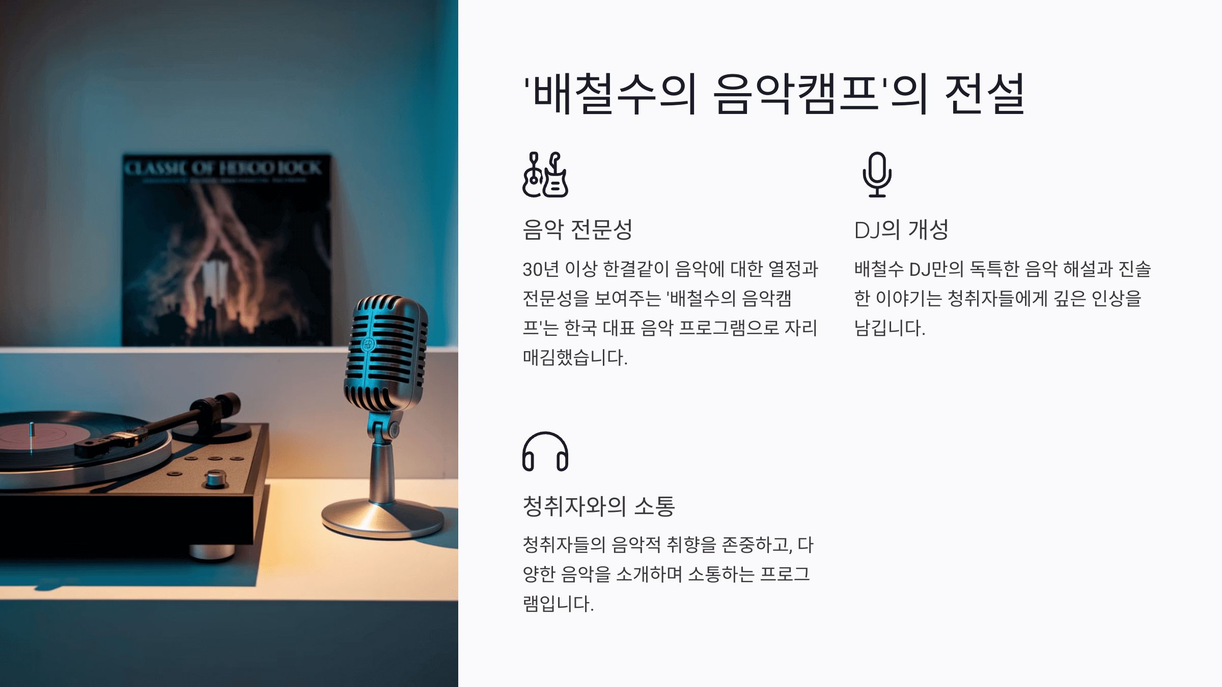 특히 록, 팝, 재즈 등 다양한 음악 장르를 다루는 점이 매력적이에요. 최신 트렌드뿐만 아니라 음악의 역사를 조명하는 시간도 제공해요. 덕분에 이 프로그램은 청취자들에게 음악의 즐거움을 넘어, 지식까지 선물하죠.